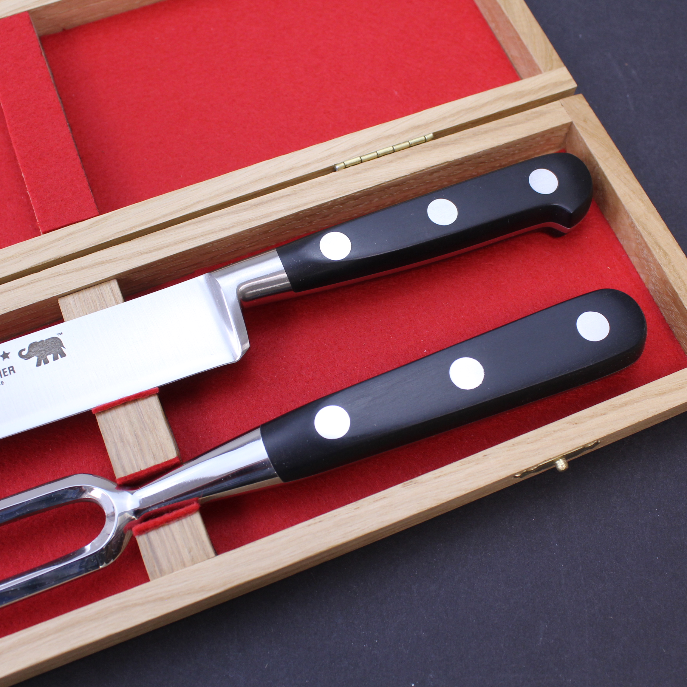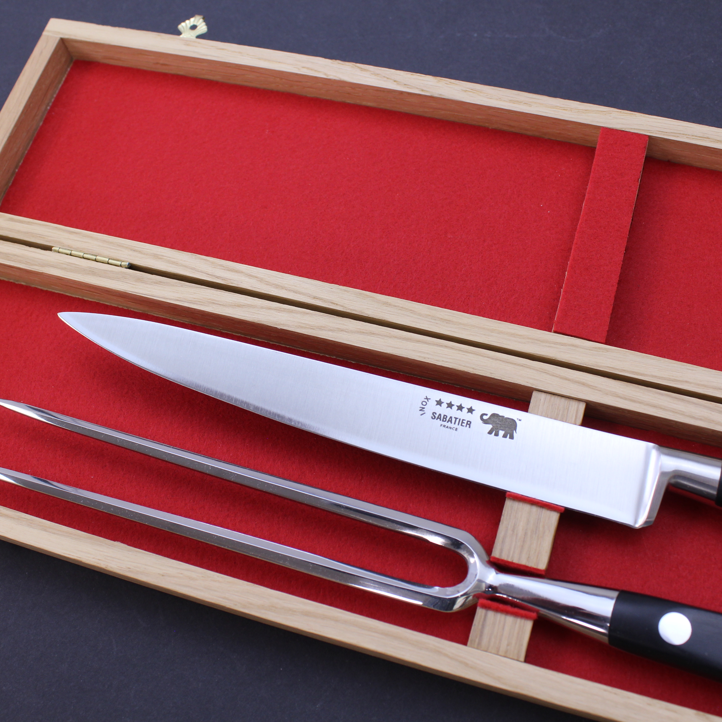 This boxed Sabatier carving knife set is an ideal Christmas or wedding gift. The set comprises of a 8"/20cm stainless steel carving knife from our traditional forged range and a 17cm bayonet fork, both with a black nylon handle. Set in an attractive branded oak box with sturdy clasps and lined with a red felt. This set is also available with Olivewood - SA300114 and Red Stamina handles - SA300113