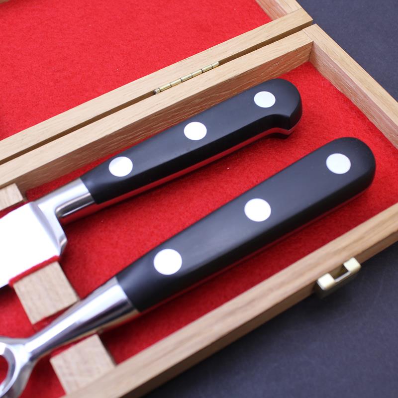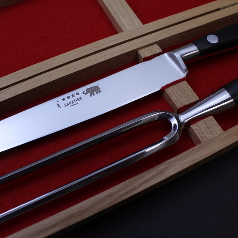 This boxed Sabatier carving knife set is an ideal Christmas or wedding gift. The set comprises of a 8"/20cm stainless steel carving knife from our traditional forged range and a 17cm bayonet fork, both with a black nylon handle. Set in an attractive branded oak box with sturdy clasps and lined with a red felt. This set is also available with Olivewood - SA300114 and Red Stamina handles - SA300113