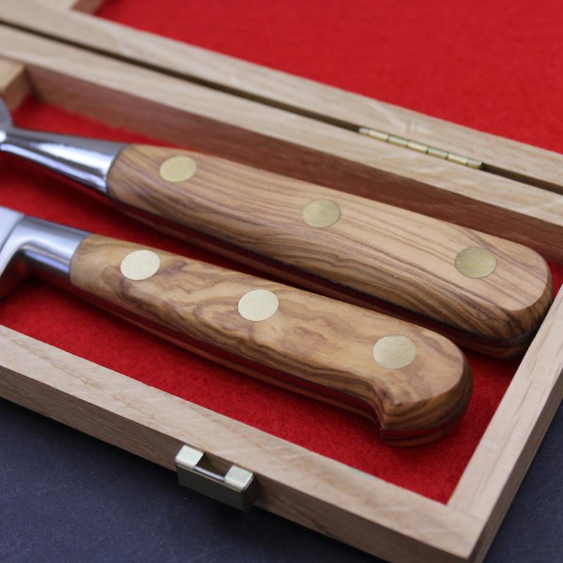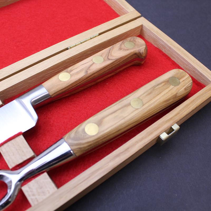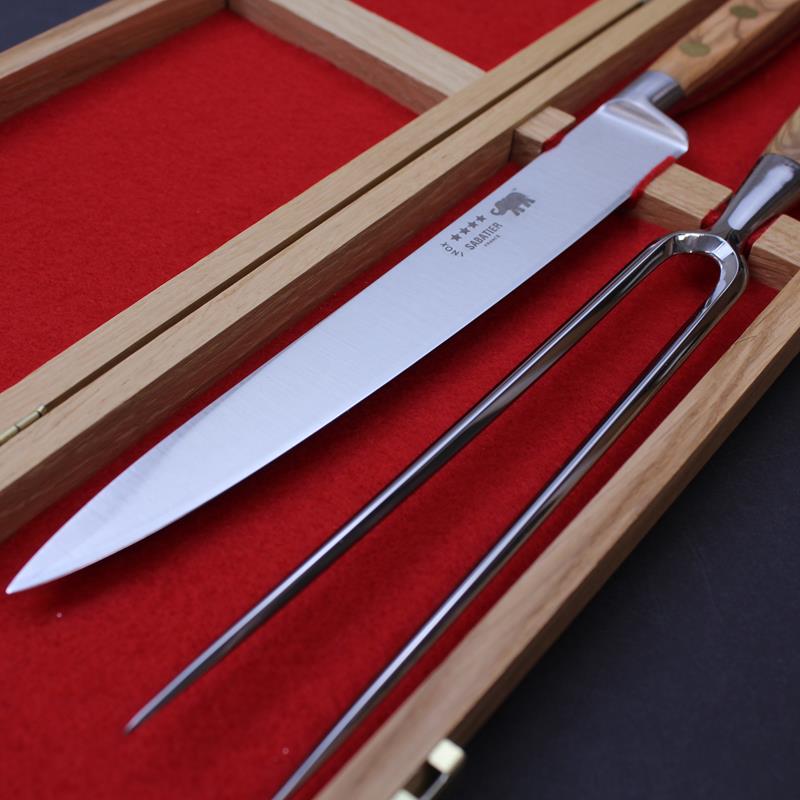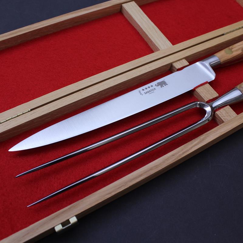 This boxed Sabatier carving knife set is an ideal Christmas or wedding gift. The set comprises of a 8"/20cm stainless steel carving knife from our traditional forged range and a 17cm bayonet fork, both with an olivewood handle. Set in an attractive branded oak box with sturdy clasps and lined with a red felt. Also can be supplied with the Yatagan style carving knife SA300106. Please indicate your preference when purchasing. This set is also available with red stamina handles - SA300113 or black nylon handles - SA300118