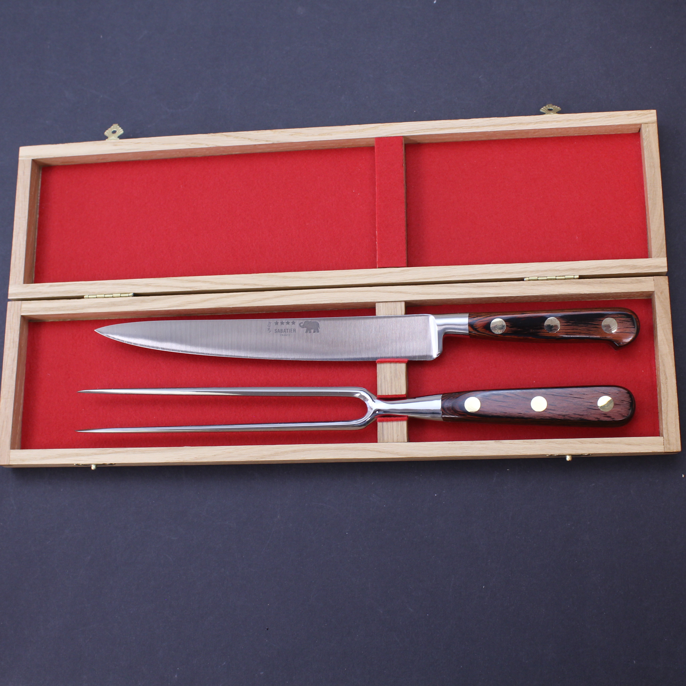 This boxed Sabatier carving knife set is an ideal Christmas or wedding gift. The set comprises of a 8"/20cm stainless steel carving knife from our traditional forged range and a 17cm bayonet fork, both with a red stamina handle. Set in an attractive oak box with sturdy clasps and lined with a red felt. This set is also available with olivewood handles - SA300114 or black nylon handles - SA300118